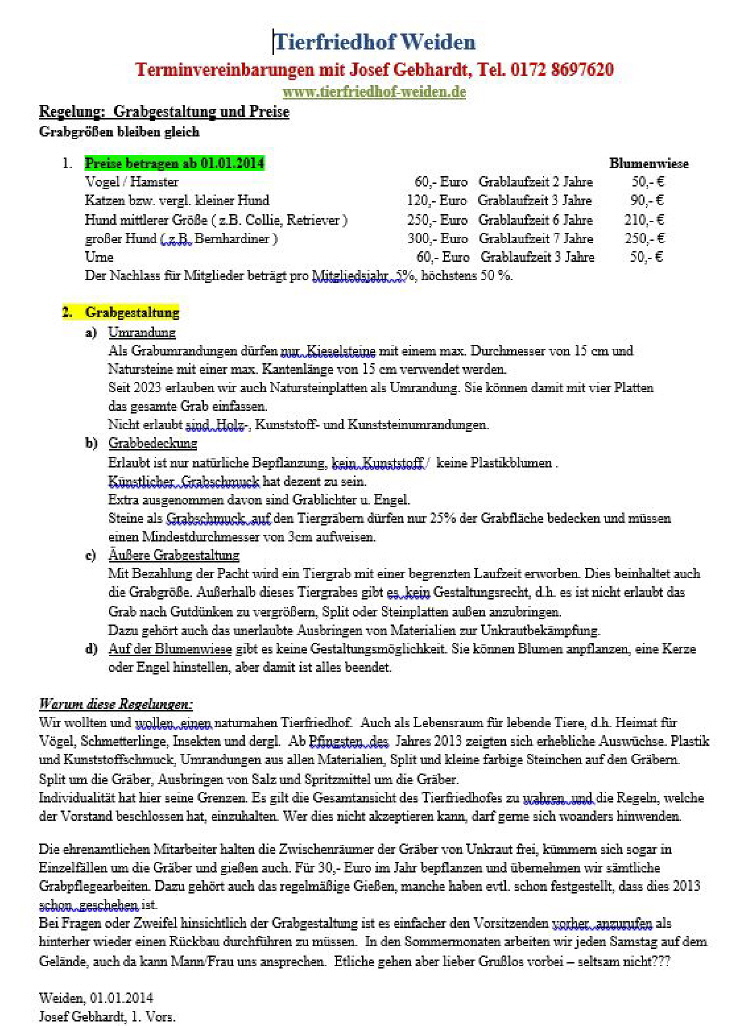 Mit Bezahlung der Pacht wird ein Tiergrab mit einer begrenzten Laufzeit erworben. Dies beinhaltet auch die Grabgröße. Außerhalb dieses Tiergrabes gibt es kein Gestaltungsrecht, d.h. es ist nicht erlaubt das Grab nach Gutdünken zu vergrößern, Split oder Steinplatten außen anzubringen.